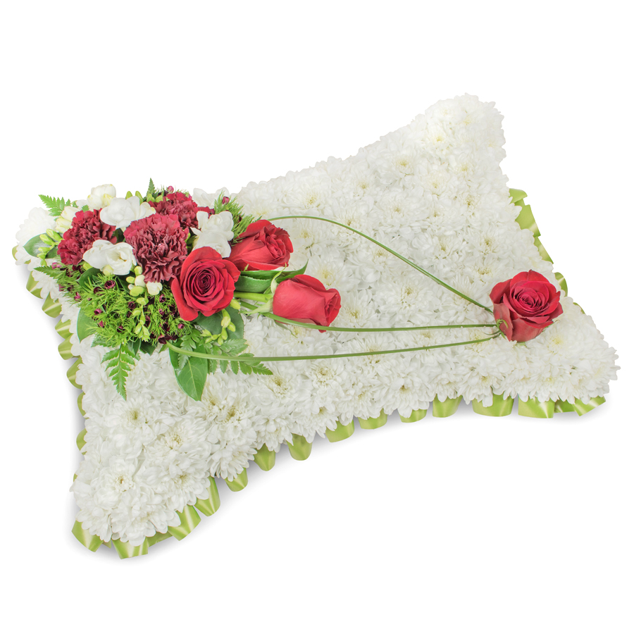 Convey your sympathies with our graceful condolence arrangement, featuring a refined selection of white chrysanthemums, red roses, white freesias, and dark red carnations, beautifully complemented by dianthus and bear grass.
